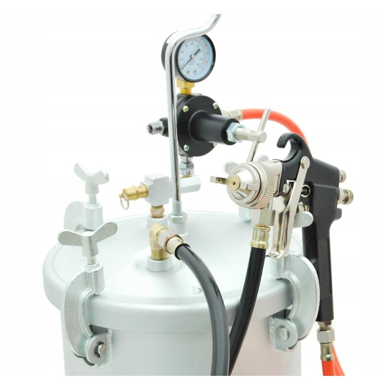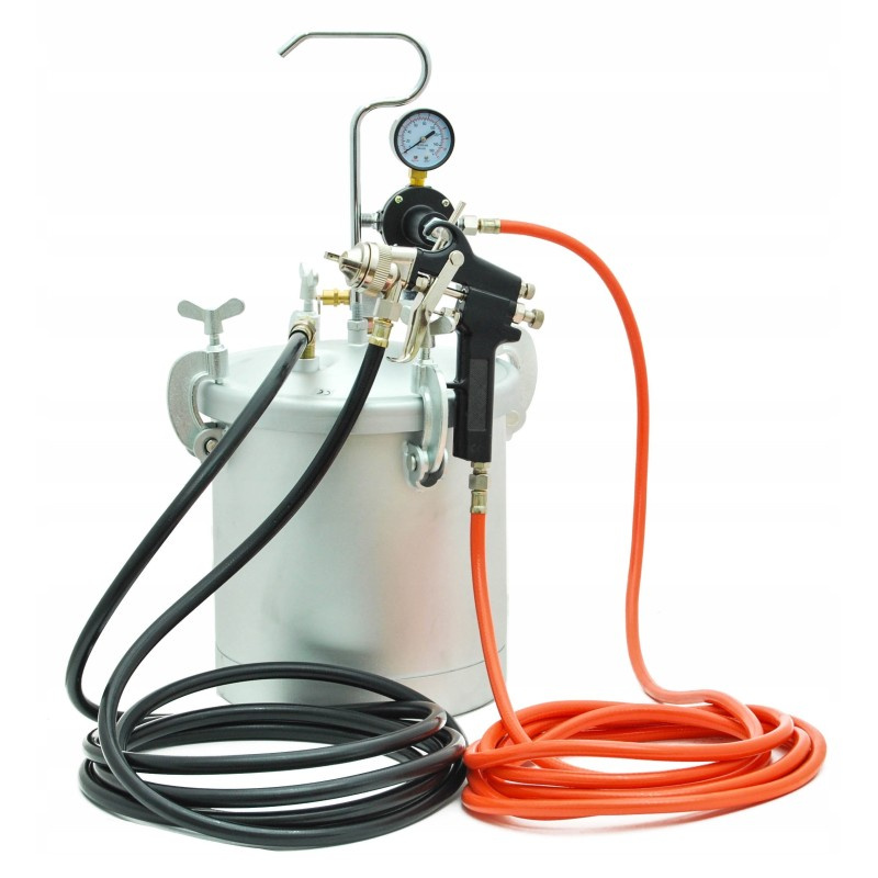 Ciśnieniowy zbiornik malarski idealnie sprawdzi się do malowania dużych powierzchni. Przeznaczony do farb i lakierów wszelkiego rodzaju bez rozcieńczalników: emulsje, bejce, farby akrylowe, kleje kontaktowe, tapety natryskowe itp. Zestaw posiada 8 l zbiornik wykonany z aluminium, na pokrywie którego mocowany jest reduktor ciśnienia, z manometrem i zaworem bezpieczeństwa. Do pistoletu lakierniczego farba podawana jest pod ciśnieniem i tam rozpylana jest przy pomocy sprężonego powietrza.