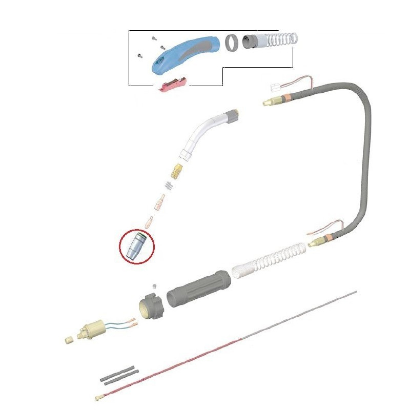 Dysza kompatybilna z uchwytami spawalniczymi MIG/MAG typu MB-401, MB-501 chłodzonych cieczą  oraz ich odpowiednikami.