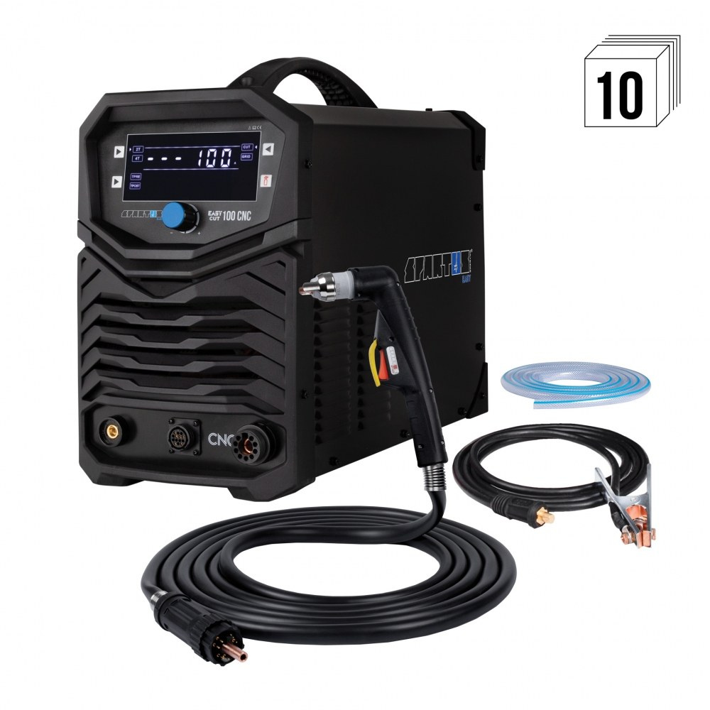 EasyCUT 100CNC pakiet SP100H 6m: źródło, uchwyt plazmowy SPARTUS® SP100H 6m, niezbędnik PLAZMA z częściami palnika, przewód masowy 3m, filtr powietrza z reduktorem, wężyk