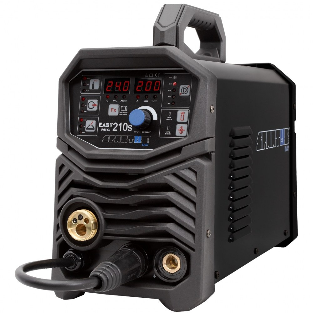 SPARTUS® EasyMIG 210s to nowoczesny, inwertorowy półautomat spawalniczy, skonstruowany w oparciu o tranzystory IGBT. Posiada funkcję spawania w osłonie gazów obojętnych i aktywnych (MIG/MAG), spawanie elektrodą otuloną (MMA) oraz spawanie TIG Lift z zajarzeniem łuku przez potarcie. Łatwa zmiana biegunowości umożliwia spawanie drutem samoosłonowym bez gazu.