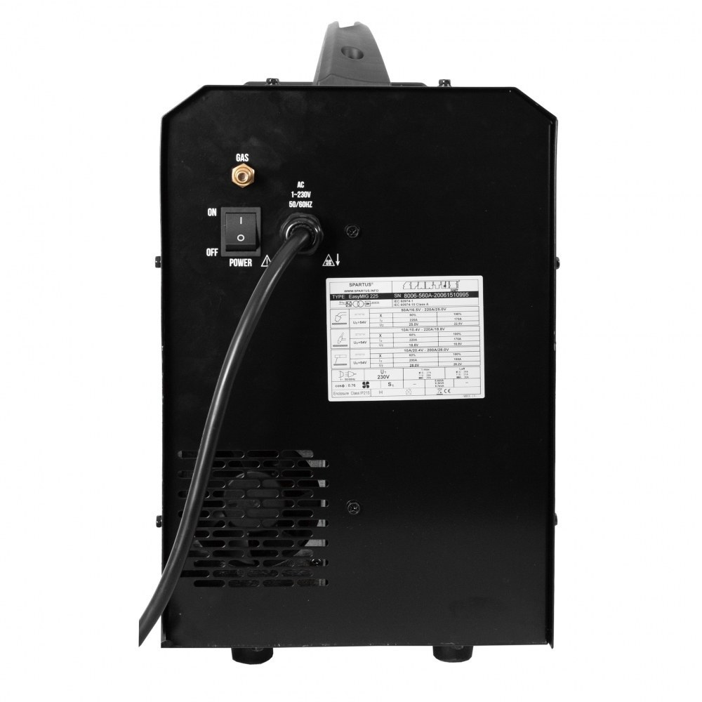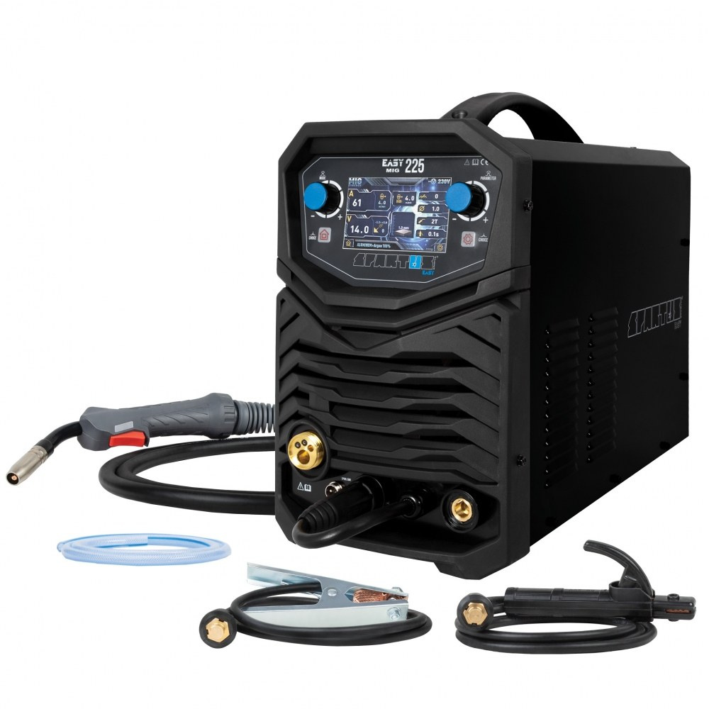 SPARTUS® EasyMIG 225 to nowoczesny, inwertorowy półautomat spawalniczy, skonstruowany w oparciu o tranzystory IGBT. Posiada funkcję spawania w osłonie gazów obojętnych i aktywnych (MIG/MAG), spawanie elektrodą otuloną (MMA) oraz spawanie TIG Lift z zajarzeniem łuku przez potarcie.