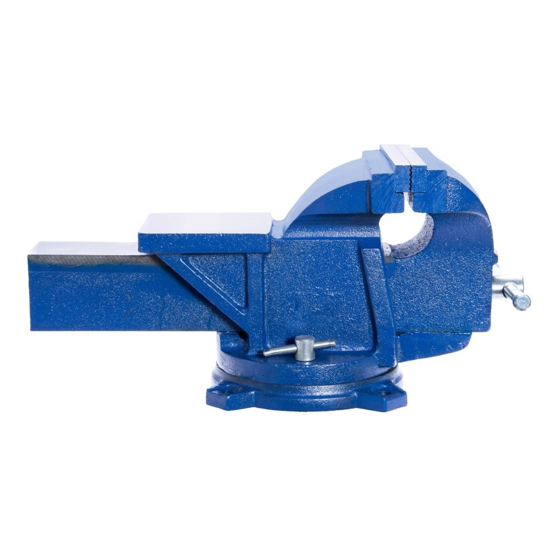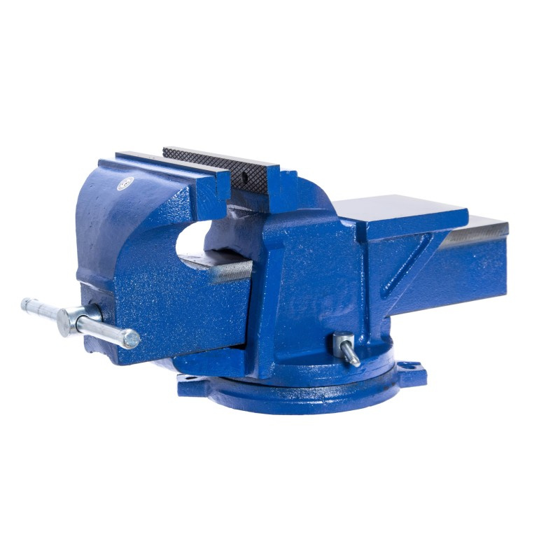 Solidne imadło ślusarskie na obrotowej podstawie. Korpus odlany z dużą starannością, posiada kowadło przydatne do kształtowania przedmiotów. Wytrzymała i sztywna konstrukcja imadła zapewnia przenoszenie dużych obciążeń oraz dobre tłumienie drgań. Solidne, wykonane z wysokiej jakości stali szczęki imadła z nacięciem krzyżowym gwarantuje pewne mocowanie obrabianego przedmiotu.