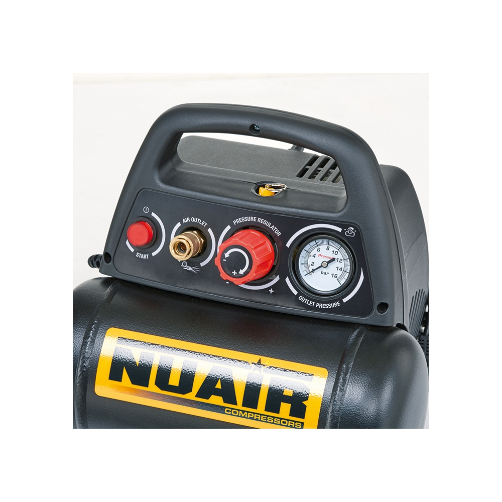 NUAIR C6BB304NUB552 to kompaktowy, bezolejowy kompresor tłokowy przeznaczony do lekkich prac domowych oraz zastosowań warsztatowych. Dzięki bezolejowej konstrukcji nie wymaga regularnej konserwacji i eliminuje ryzyko zanieczyszczenia powietrza olejem, co czyni go idealnym rozwiązaniem do czystych i precyzyjnych zastosowań. Parametry: OGÓLNE POJEMNOŚĆ ZBIORNIKA 6l RODZAJ BEZOLEJOWY CIŚNIENIE MAKSYMALNE 8bar CYKL PRACY S3/25% TEMPERATURA PRACY °C 5-40 WYDAJNOŚĆ WEJŚCIOWA 180l/min WYDAJNOŚĆ WYJŚCIOWA 87l/min SILNIK MOC 1,5Hp/1,1kW OBROTY 3400 obr/min NAPIĘCIE 230V/50Hz POBÓR PRĄDU -ROZRUCH-Ir 8,6A POBÓR PRĄDU-PRACA-Iz 5,5A ZABEZPIECZENIE POMPA MODEL OL195 ILOŚĆ TŁOKÓW 1 ILOŚĆ STOPNI SPRĘŻANIA 1 POZIOM MOCY AKUSTYCZNEJ Lwa 97 dB POZIOM MOCY AKUSTYCZNEJ Lwa m 95,10 dB WYMIARY OPAKOWANIE SxGxW 580x240x580 WAGA BRUTTO 24 kg
