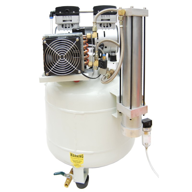 Profesjonalna bezolejowa tłokowa sprężarka z osuszaczem adsorbcyjnym. Przystosowana do pracy w laboratoriach, gabinetach medycznych, stomatologicznych i protetycznych. Niezastąpiona w miejscach w których wymagane jest źródło sprężonego, idealnie suchego i pozbawionego oleju powietrza. Bezolejowa pompa zastosowana w kompresorze jest niezwykle cicha i sprawna, a zastosowanie chłodnicy jeszcze bardziej poprawiło jej parametry. Kompaktowa konstrukcja ze zintegrowanym osuszaczem czynią z niej idealne rozwiązanie dla gabinetów z małą ilością miejsca, a niski poziom hałasu (55 dB) pozwala na montaż bezpośrednio przy stanowisku pracy. Przyjazna w obsłudze, łatwa w serwisowaniu.