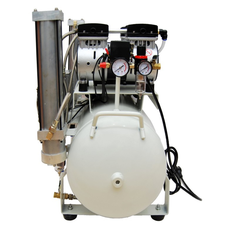 Profesjonalna bezolejowa tłokowa sprężarka z osuszaczem adsorbcyjnym. Przystosowana do pracy w laboratoriach, gabinetach medycznych, stomatologicznych i protetycznych. Niezastąpiona w miejscach w których wymagane jest źródło sprężonego, idealnie suchego i pozbawionego oleju powietrza. Dwie bezolejowe pompy zastosowane w kompresorze są niezwykle ciche i wydajne, a zastosowanie chłodnicy jeszcze bardziej poprawiła parametry całego urządzenia. Kompaktowa konstrukcja ze zintegrowanym osuszaczem czynią z niej idealne rozwiązanie dla gabinetów z małą ilością miejsca, a niski poziom hałasu (55 dB) pozwala na montaż bezpośrednio przy stanowisku pracy. Przyjazna w obsłudze, łatwa w serwisowaniu. Super wydajna i nowoczesna sprężarka, z emaliowanym od środka zbiornikiem, umożliwia podpięcie kilku unitów stomatologicznych, lub innych urządzeń wymagających niezwykle czystego i suchego powietrza. Najwyższej jakości materiały oraz sprawdzone komponenty czynią kompresor bardzo żywotnym i niezawodnym.