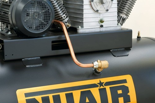NUAIR SPRWB05NUA to jeden z najmocniejszych kompresorów tłokowych dostępnych na rynku, zaprojektowany z myślą o pracy w najbardziej wymagających warunkach przemysłowych. To urządzenie klasy heavy-duty, które gwarantuje maksymalną wydajność, niezawodność i bezpieczeństwo działania, nawet przy ciągłej eksploatacji. Kompresor wyposażony jest w silnik o mocy 20 KM (15 kW), zbiornik o pojemności 900 litrów oraz dwustopniową pompę widlastą, która dzięki zastosowaniu chłodnic międzystopniowych, końcowych oraz rur żebrowanych zapewnia skuteczne chłodzenie sprężonego powietrza i długą żywotność całego układu. Dzięki imponującej wydajności 2148 l/min oraz maksymalnemu ciśnieniu roboczemu 11 bar, urządzenie doskonale sprawdzi się w dużych zakładach przemysłowych, lakierniach, liniach produkcyjnych oraz wszędzie tam, gdzie potrzebna jest duża ilość sprężonego powietrza o wysokim ciśnieniu. Zastosowany rozrusznik gwiazda-trójkąt chroni silnik przed przeciążeniami i zmniejsza pobór prądu podczas uruchamiania, co przekłada się na oszczędność energii i dłuższą żywotność sprzętu. Parametry: Ilość obrotów na minutę: 1000obr/min. Liczba cylindrów: 2 Wydajność na ssaniu: 2148l/min. Ciśnienie: 11 bar Silnik: 15 kW Moc (KM): 20 Napięcie: 400V Waga: 510kg Pompa: NK100 Wymiary: 2300 x 895 x 1880
