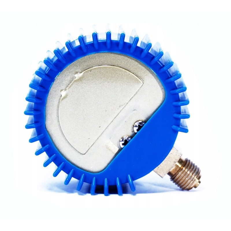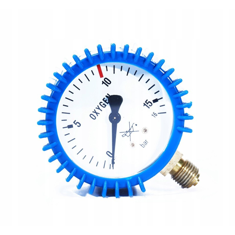 Manometr zegarowy do reduktorów butlowych spawalniczych z osłoną gumową. Manometr działa na zasadzie sprężystego odkształcenia sprężyny rurkowej Bourdona pod wpływem zmiany zadanego ciśnienia.