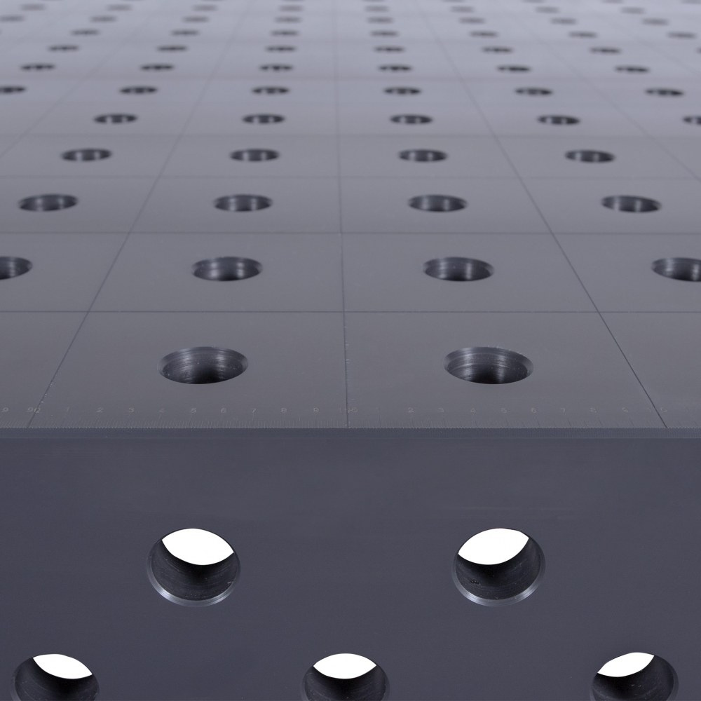 • STAL S355J2+N AZOTOWANA Stal S355J2+N, wykorzystana do wykonania stołu, daje wysoką wytrzymałość i odporność na uderzenia, a plazmowe azotowanie spawanego blatu zwiększa ochronę przed korozją i odpryskami spawalniczymi