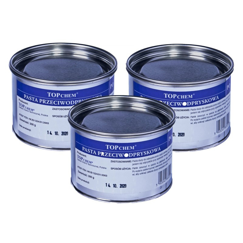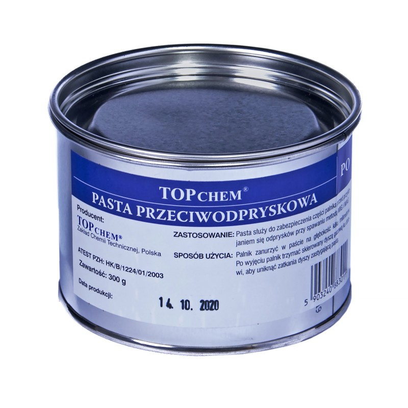 Pasta przeciwodpryskowa TOPCHEM służy do zabezpieczenia części palnika, przed przyklejaniem się odprysków przy spawaniu metodą MIG/MAG. Zwiększażywotność części eksploatacyjnych palnika, zapewnia utrzymanie odpowiedniej osłony gazowej spoiny. Nie zawiera silikonu, rozpuszczalników organicznych, jej użycie nie ma negatywnego wpływu na procesy spawalnicze oraz nie powoduje wad spawalniczych w spoinach. Sprawdza się w przemyśle stoczniowym, hutniczym, motoryzacyjnym itp. Co pewien czas w trakcie spawania zanurzać gorąca końcówkę palnika w paście.