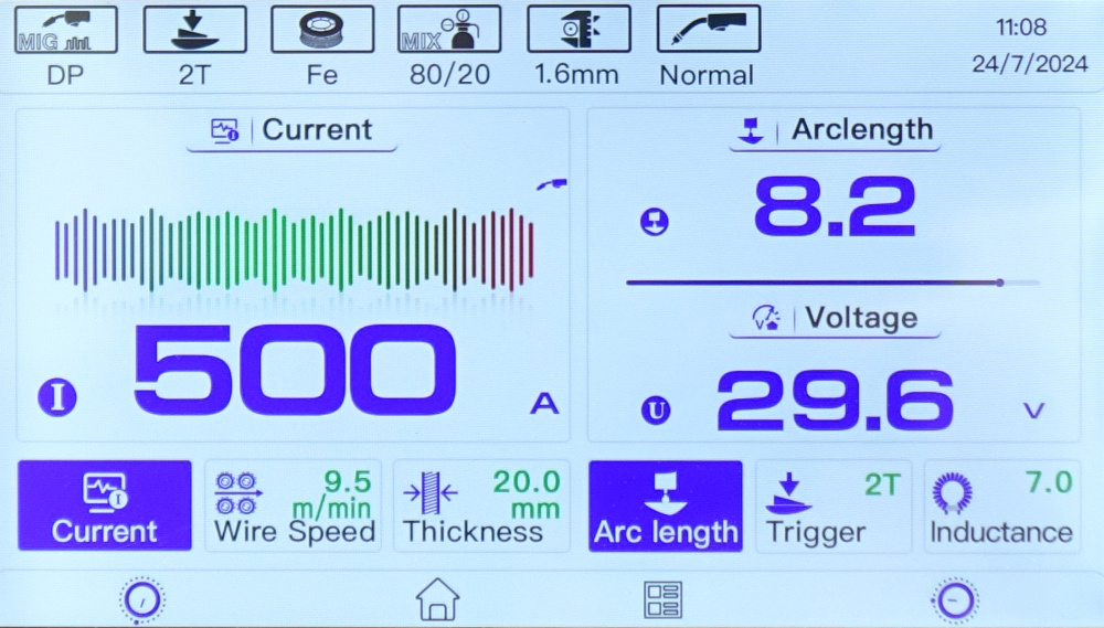 Szybka regulacja synergiczna parametrów spawania poprzez 7-calowy, dotykowy wyświetlacz LCD, czyni urządzenie bardzo łatwym w użyciu. Wystarczy ustawić grubość i rodzaj spawanego materiału i zacząć spawać: inteligentny i automatyczny układ kontroli łuku spawalniczego, krok po kroku, dobierze najlepsze parametry, dla każdej pozycji spawania i dla każdego materiału. Użytkownik może również ustawić ręcznie długość łuku spawalniczego i dopasować wygląd spoiny do własnych potrzeb. Przy metodzie MIG/MAG mamy możliwość wyboru trybu przycisku w uchwycie, pomiędzy pracą w trybie SPOT (spawanie punktowe), 2-takt (bez blokady), 4-takt (blokada przycisku do długich spoin),S2-takt oraz S4-takt.