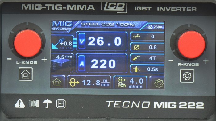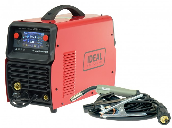 TECNO MIG 222 LCD SYNERGIC jest inwertorowym synergicznym półautomatem spawalniczym przeznaczonym do spawania łukowego metodą MIG/MAG, TIG LIFT, MMA oraz FLUX. Urządzenie zostało zaprojetowane do szerokiego zakresu zastosowań: od prac konserwacyjnych do napraw nadwozi samochodowych. Stosowane jest do lutospawania blach ocynkowanych, spawania stali nierdzewnej, stali węglowych i niskostopowych oraz aluminium. Spawanie odbywa się w osłonie gazu obojętnego, aktywnego bądź mieszanki, oraz przy odwrotnej biegunowości bez gazu. Urządzenie posiada 3 tryby synergiczne do spawania stali węglowych oraz jeden tryb do aluminium. Korzystając z ustawień ręcznych można dostosować urządzenie do lutospawania. Przy metodzie MIG/MAG mamy możliwość wyboru funkcji przycisku w uchwycie pomiędzy pracą w trybie 2T(bez blokady przycisku)/4T(blokada przycisku do długich spoin) Przy metodzie MMA mamy mozliwość włącznia funkcji VRD (VOLTAGE REDUCTION Device) - redukuje napięcie spoczynkowe stanu jałowego na elektrodzie do wartości bezpiecznej. Zapewnia bezpieczeństwo przeciporażeniowe podczas pracy w wilgotnym środowisku. Szybka regulacja synergiczna parametrów spawania poprzez wyświetlacz LCD czyni urządzenie bardzo łatwym w użyciu. Wyświetlacz LCD umożliwia dokładną regulację parametrów spawania takich jak : napięcie spawania prędkość podawania drutu regulacja indukcyjności HOT START (MMA) ARC FORCE (MMA) TECNO MIG 222 LCD SYNERGIC posiada układ chłodzenia wentylatorem, co zdecydowanie zwiększa jego wydajność. Wyposażony jest, także w zabezpieczenie przeciw przeciążeniu, co zwiększa jego niezawodność. Urządzenie jest wyposażone we wtyczkę zasilania. Dostawa obejmuje urządzenie z uchwytem spawalniczym MIG 15 o długości 3 metry, przewodem masowym o długości 2,5 metra oraz przewodem elektrodowym o długości 2,5 metra. Parametry: Prąd pobierany z sieci 45 A Zabezpieczenie sieci zasilającej 25 A zwłoczny (typu C) Znamionowe napięcie zasilania 230 V; 50Hz (1ph) Moc 7,7kW Napięcie stanu jałowego 54V Prąd maksymalny 220A Prąd przy pracy 100% 170A (MIG/TIG) / 155 A (MMA) Prąd przy pracy 60% 220A (MIG/TIG) / 200 A (MMA) Średnica drutu aluminiowego 0,8 - 1,0mm Średnica drutu do lutospawania 0,8mm Średnica drutu samoosłonowego 0,8 - 1,2mm Średnica drutu stalowego 0,8 - 1,0mm Średnica elektrody spawalniczej 1,6 - 4,0mm Zakres regulacji prądu spawania 30-220A (MIG) / 10-200A (MMA) / 10-220A (TIG) Rozmiar szpuli drutu D200 (2kg i 5kg) oraz 15kg Stopień ochrony IP21S Waga urządzenia / zestawu 19/25kg Wymiary gabarytowe dł x szer x wys 590x250x455 mm Wymiary opakowania dł x szer x wys 650x350x505 mm