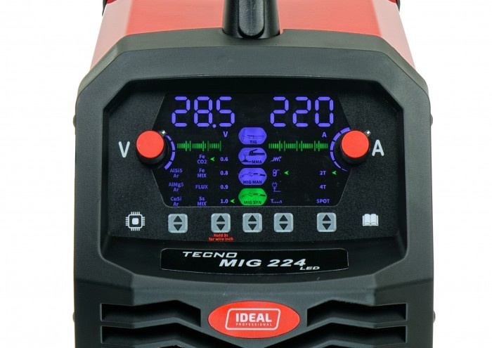 TECNOMIG 224 SYNERGIC LED 4x4 jest inwertorowym synergicznym półautomatem spawalniczym przeznaczonym do spawania łukowego metodą MIG/MAG, TIG LIFT, MMA oraz FLUX.