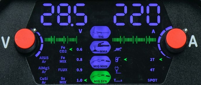Duży i czytelny wyświetlacz LED pozwala na bieżąco kontrolować oraz regulować parametry spawania MIG/MAG takie jak: