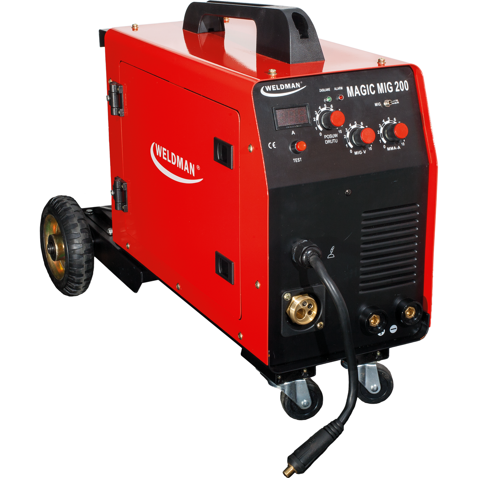 Spawarka Magic Mig 200 jest przeznaczona do spawania drutami spawalniczymi o średnicy 0,6-1,0 mm, drutami samoosłonowymi 0,9 mm oraz elektrodami otulonymi o średnicy do 4 mm stali niskowęglowej, niskostopowej (MAG), stopowej (MIG), aluminium oraz odlewów żeliwnych. Max szpula 5 kg D200. Półautomat spawalniczy Magic Mig 200 znajdzie swoje zastosowanie przede wszystkim w małych warsztatach, serwisach, które zajmują się blacharstwem samochodowym, gospodarstwach rolnych oraz wszędzie tam, gdzie ważna do prac wymagana jest mobilność oraz skuteczne działanie zestawu.