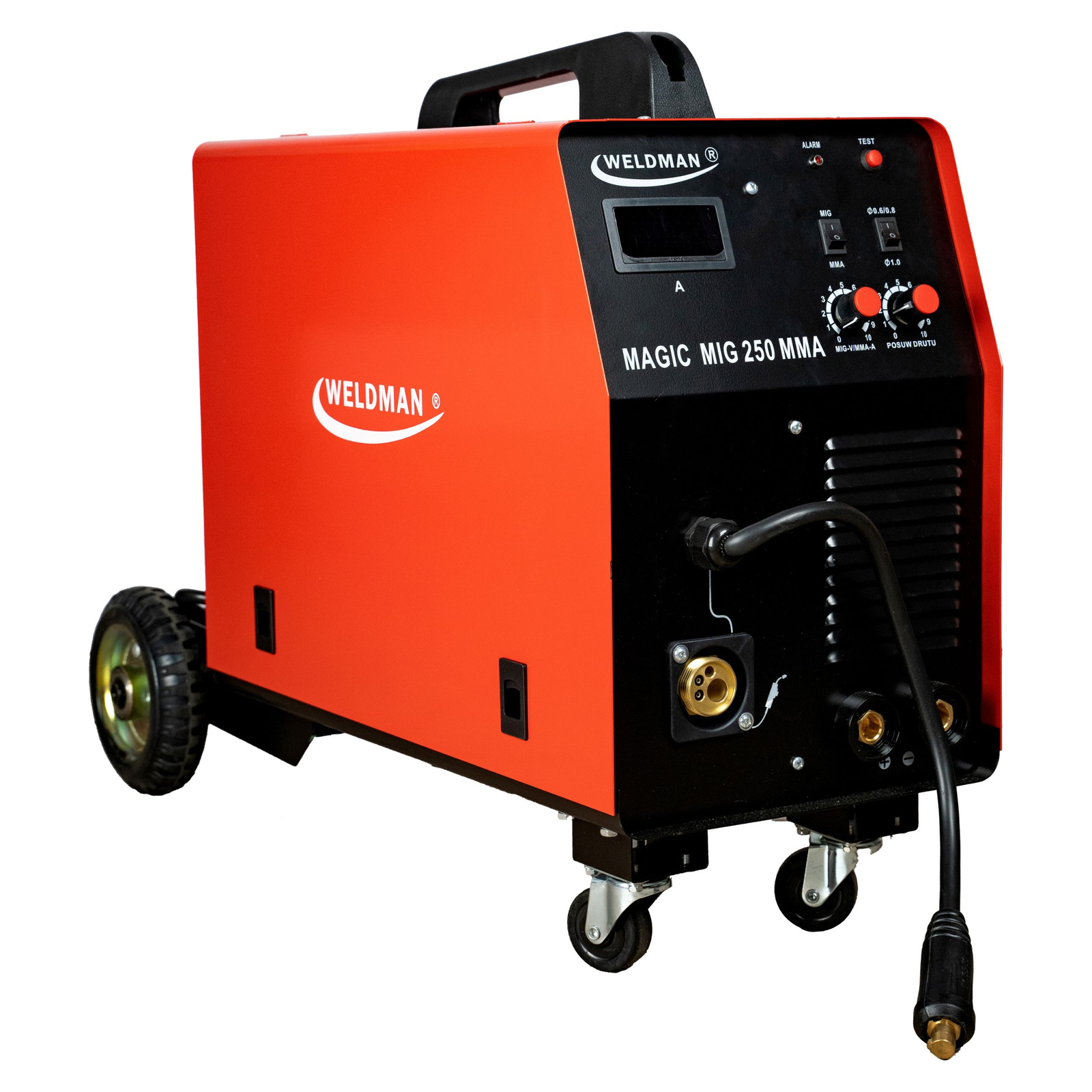 Spawarka Magic Mig 250 jest przeznaczona do spawania drutami spawalniczymi o średnicy 0,6-1,0 mm, drutami samoosłonowymi 0,9 mm oraz elektrodami otulonymi o średnicy do 4 mm stali niskowęglowej, niskostopowej (MAG), stopowej (MIG), aluminium oraz odlewów żeliwnych. Max szpula 15 kg D300. Półautomat spawalniczy Magic Mig 250 znajdzie swoje zastosowanie przede wszystkim w małych warsztatach, serwisach, które zajmują się blacharstwem samochodowym, gospodarstwach rolnych oraz wszędzie tam, gdzie ważna do prac wymagana jest mobilność oraz skuteczne działanie zestawu.