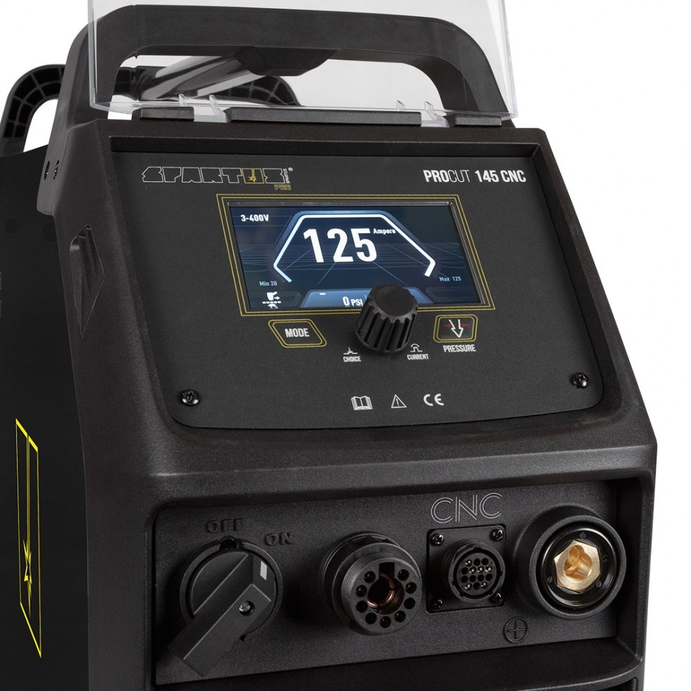 Kluczowym atutem SPARTUS® ProCUT 145CNC jest jej zintegrowane gniazdo sterowania CNC, co czyni ją idealną do zastosowań wymagających wysokiej precyzji i powtarzalności cięć. Zastosowanie najnowszej technologii pozwoliło osiągnąć wyjątkową jakość cięcia przy użyciu prądu cięcia wynoszącego 125A, co przy 100% cyklu pracy gwarantuje niezawodność i wydajność nawet w najbardziej wymagających projektach.