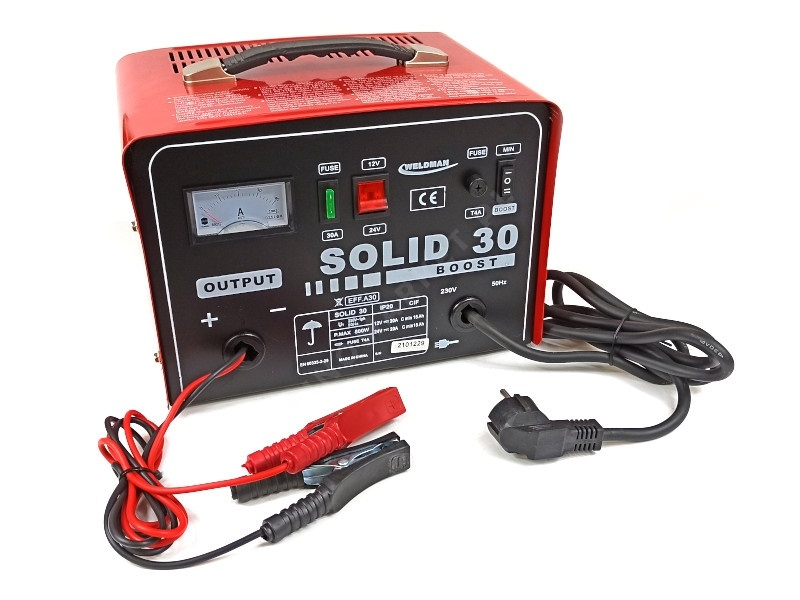 Prostownik SOLID 30 posiada automatyczne zabezpieczenie przed przeładowaniem i błędną polaryzacją. Urządzenie wyposażone jest w przełącznik szybkiego ładowania (BOOST).