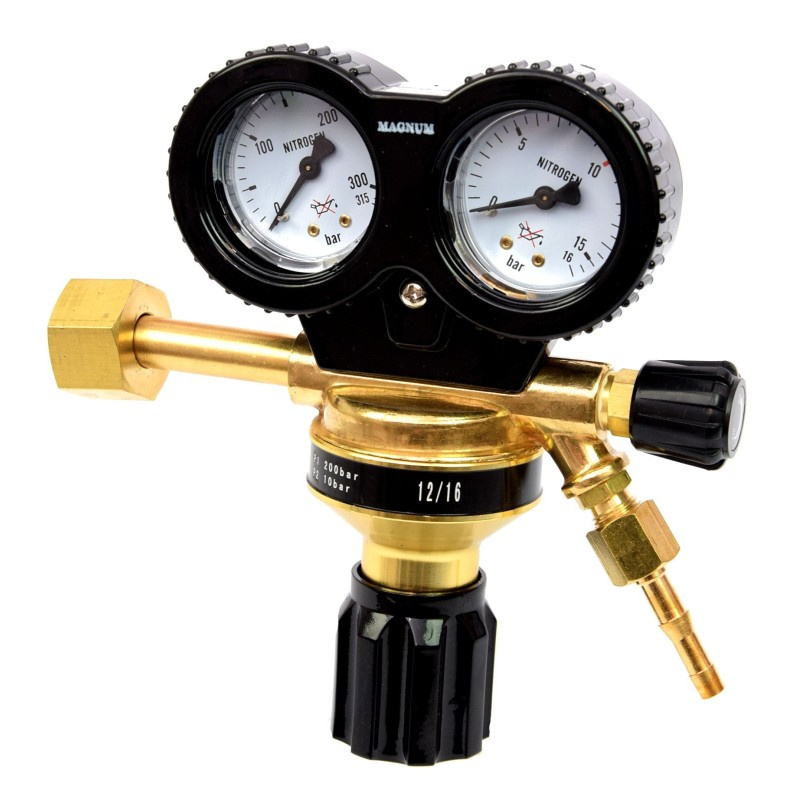 Solidny, dokładny reduktor butlowy marki MAGNUM z osłoną manometrów i zaworem odcinającym przeznaczony do AZOTU
