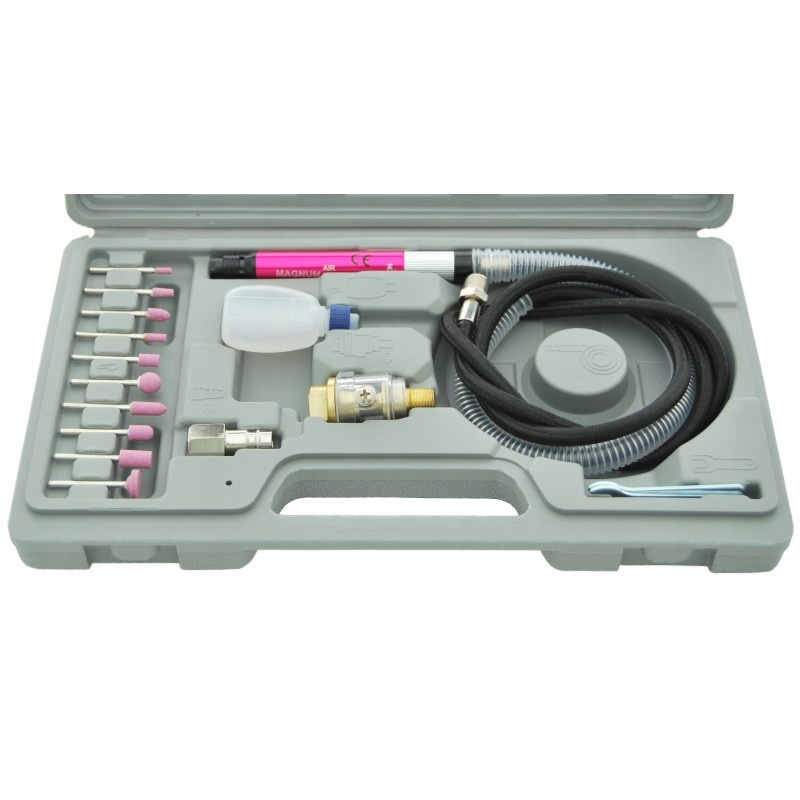 Pneumatyczna szlifierka trzpieniowa mini typu pencil. Niezastąpione narzędzie dla każdego spawacza, modelarza, ślusarza, mechanika czy serwisanta wykonującego precyzyjne prace. Może współpracować z kamieniami i frezami palcowymi (pilnikami) o średnicy 3 mm. Lekka i ergonomiczne wyprofilowana. Niewielkie zapotrzebowanie na powietrze pozwalają na współpracę nawet z małym kompresorem.