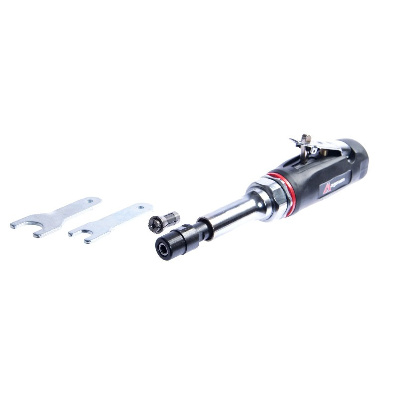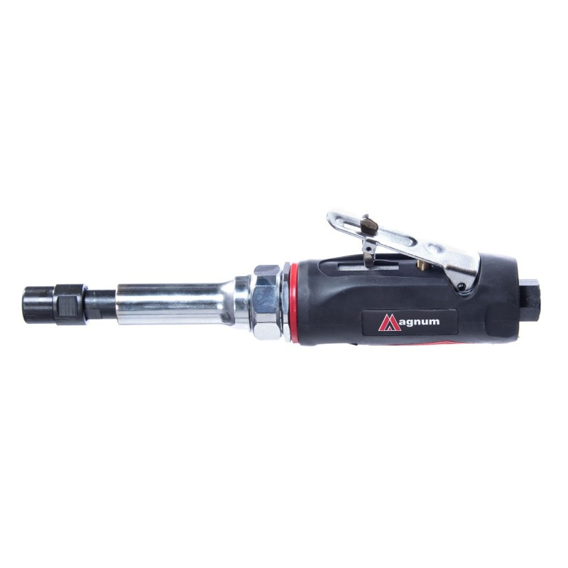 Pneumatyczna szlifierka trzpieniowa marki MAGNUM. Niezastąpione narzędzie dla każdego spawacza, ślusarza, mechanika czy serwisanta. Dodatkowym atutem szlifierki jest przedłużony trzpień roboczy który pozwala na pracę w trudno dostępnych miejscach. Może współpracować z kamieniami i frezami palcowymi (pilnikami) o średnicy 3 i 6 mm. Lekka i ergonomiczne wyprofilowana. Spust wyposażony w blokadę zabezpieczającą przed przypadkowym uruchomieniem. Wylot powietrza umieszczony z tyłu urządzenia.