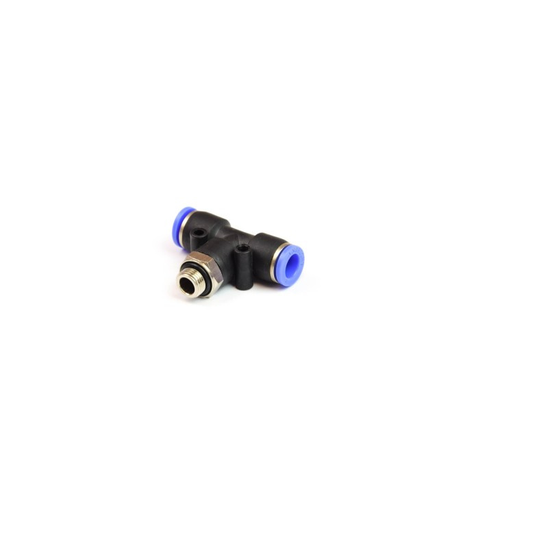 Złączka wtykowa trójnik obrotowy typu T do instalacji pneumatycznych pozwala na proste i szybkie łączenie elementów instalacji pneumatycznych. Połączenie pomiędzy częścią metalową, a korpusem z tworzywa pozwala na wykonanie obrotu w celu odpowiedniego ułożenia kierunku przewodu.