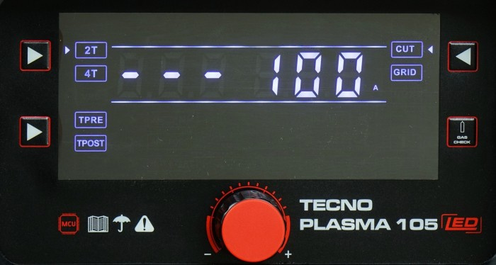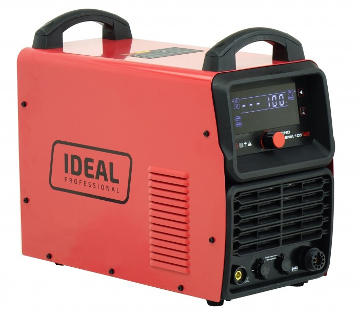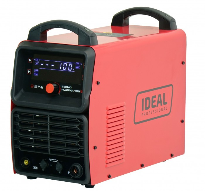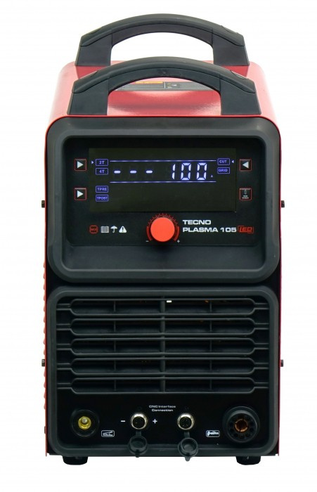 TECNO PLASMA 105 LED jest profesjonalnym urządzeniem do cięcia plazmowego. Umożliwia cięcie bez zniekształceń: stali, stali nierdzewnej, aluminium, mosiądzu i miedzi. Sterowana elektronicznie, płynna regulacja prądu cięcia. Przecinarka posiada dwa tryby pracy: CUT (praca ciągła) oraz GRID (praca przerywana). Czytelny wyświetlacz LED umożliwia dokładną regulację urządzenia, nawet przy bardzo mocnym oświetleniu. Możliwość wyboru funkcji przycisku w uchwycie pomiędzy pracą w trybie 2T (bez blokady przycisku) / 4T (blokada przycisku do długich cięć). Urządzenie posiada regulację czasu chłodzenia uchwytu po zakończeniu cięcia. Przecinarka plazmowa jest kompatybilna z systemami CNC TECNO PLASMA 105 LED posiada układ chłodzenia wentylatorem co zdecydowanie zwiększa jego wydajność. Wyposażony jest w zabezpieczenie przeciw przeciążeniu, co zwiększa jego niezawodność. Urządzenie wyposażone jest we wtyczkę zasilania. Dostawa obejmuje urządzenie z uchwytem plazmowym ręcznym IPT100 ze złączem centralnym o długości 6m, przewodem masowym o długości 2m oraz wtykami sterującymi do intergracji z systemem CNC. Parametry: Zabezpieczenie sieci zasilającej C25 A Znamionowe napięcie zasilania 3x400 V; 50Hz (3ph) Moc 13,5 kW Napięcie stanu jałowego 325 V Prąd maksymalny 100 A Prąd przy pracy 100% 77 A Prąd przy pracy 60% 100 A Stopień ochrony IP21S Waga 19 kg Wymiary gabarytowe dł x szer x wys 580x250x420 mm Wymiary opakowania dł x szer x wys 650x310x515 mm Ciśnienie sprężonego powietrza 5 - 6 bar Grubość cięcia (max) 50 mm (rozdzielające) / 45 mm (jakościowe) Wydajność sprężonego powietrza 120 l/min Zakres regulacji prądu cięcia 20 - 100 A