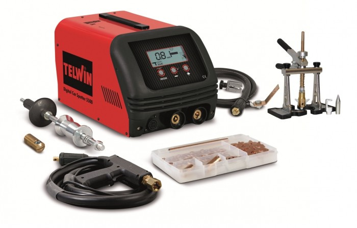 Sterowane mikroprocesorem urządzenie do wyciągania, zgrzewania jednostronnego, łatania i rozgrzewania elektrodą węglową blach. Przeznaczone w szczególności do napraw karoserii samochodowych.