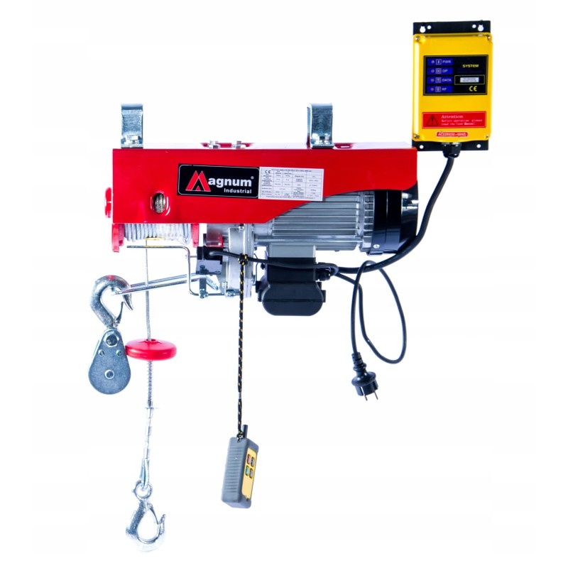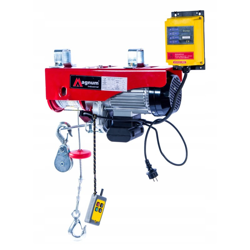 Zdalnie sterowana elektryczna wciągarka linowa marki MAGNUM. Wciągarka sterowana jest bezprzewodowo, dzięki czemu poprawiono wygodę oraz bezpieczeństwo operatora. Urządzenie wyposażone jest czujnik krańcowy zabezpieczający wciągarkę przed wciągnięciem ładunku w bęben. Wciągarka posiada również zabezpieczenie przed nadmiernym rozwinięciem liny i nawinięciem jej w złym kierunku. Nad bezpieczeństwem pracy czuwa zblocze z zabezpieczeniem oraz hamulec elektromagnetyczny. Ergonomiczny pilot dobrze leży w dłoni. W zestawie uchwyty montażowe.