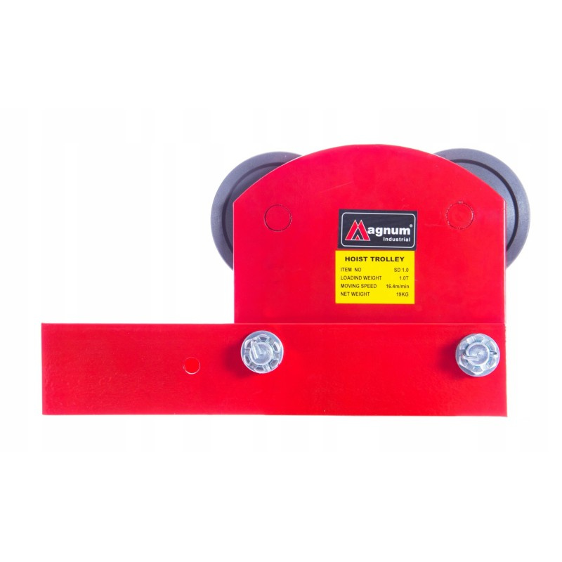 Ręczny wózek suwnicowy marki MAGNUM, do montażu na wciągarkach elektrycznych w celu usprawnienia wykonywanych prac i zwiększenia mobilności oraz kontroli transportowanego ładunku. Wózek dzięki odpowiedniemu systemowi można montować do dwuteowników w zakresie od 69 mm do 98 mm.