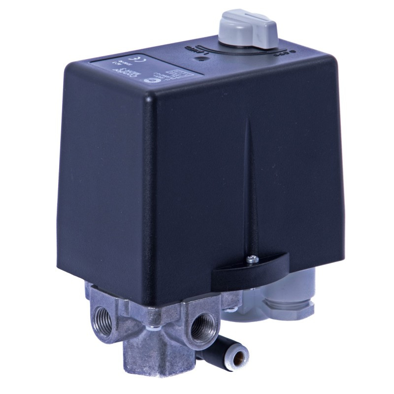 Przełącznik ciśnieniowy marki CONDOR, używany do utrzymywania ciśnienia w zbiorniku kompresora pomiędzy zadaną górną i dolną wartością ciśnienia. Sterownik przeznaczony do silników trójfazowych.