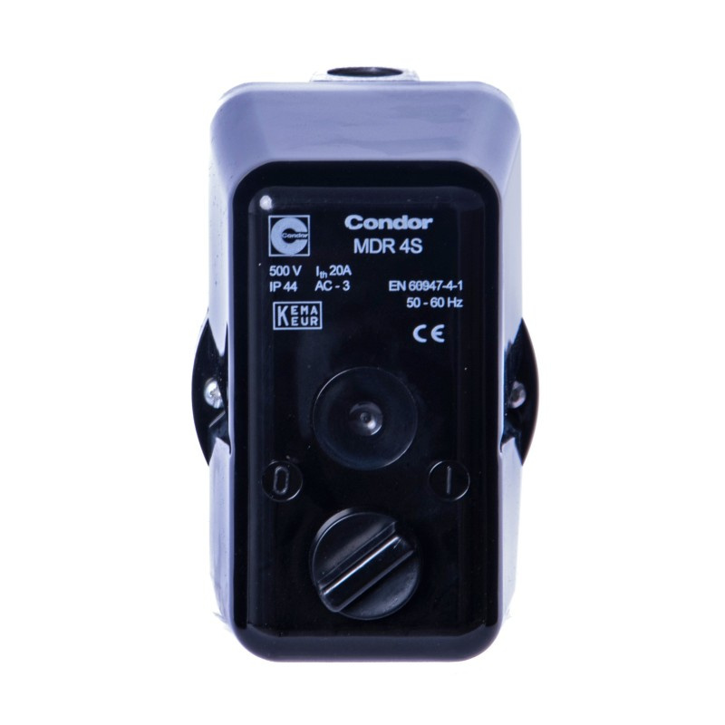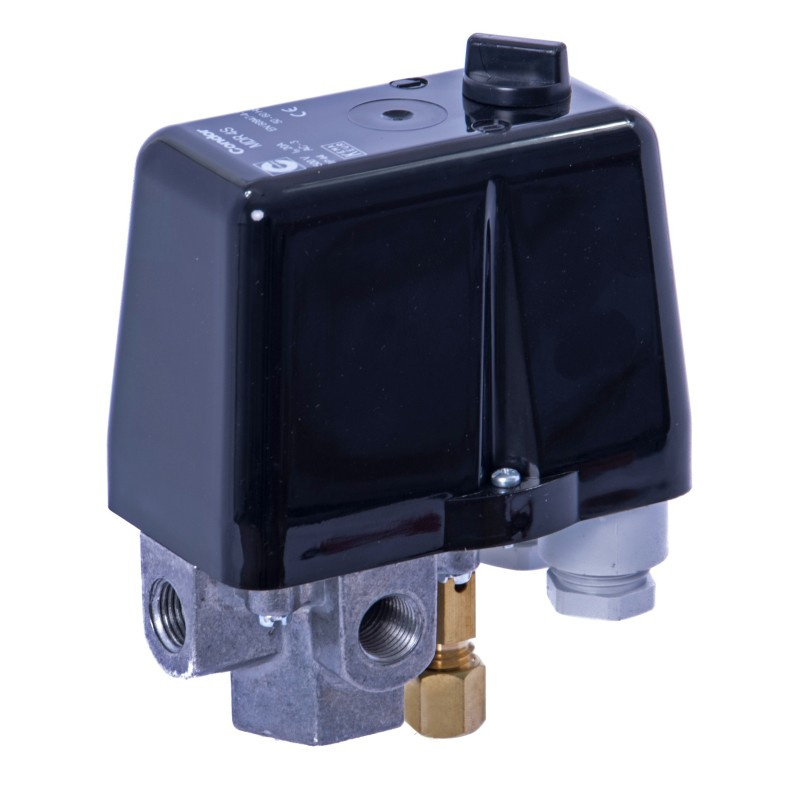 Przełącznik ciśnieniowy marki CONDOR, używany do utrzymywania ciśnienia w zbiorniku kompresora pomiędzy zadaną górną i dolną wartością ciśnienia. Sterownik przeznaczony do silników trójfazowych.