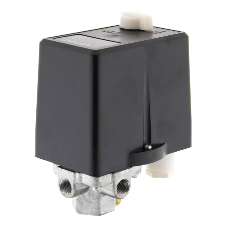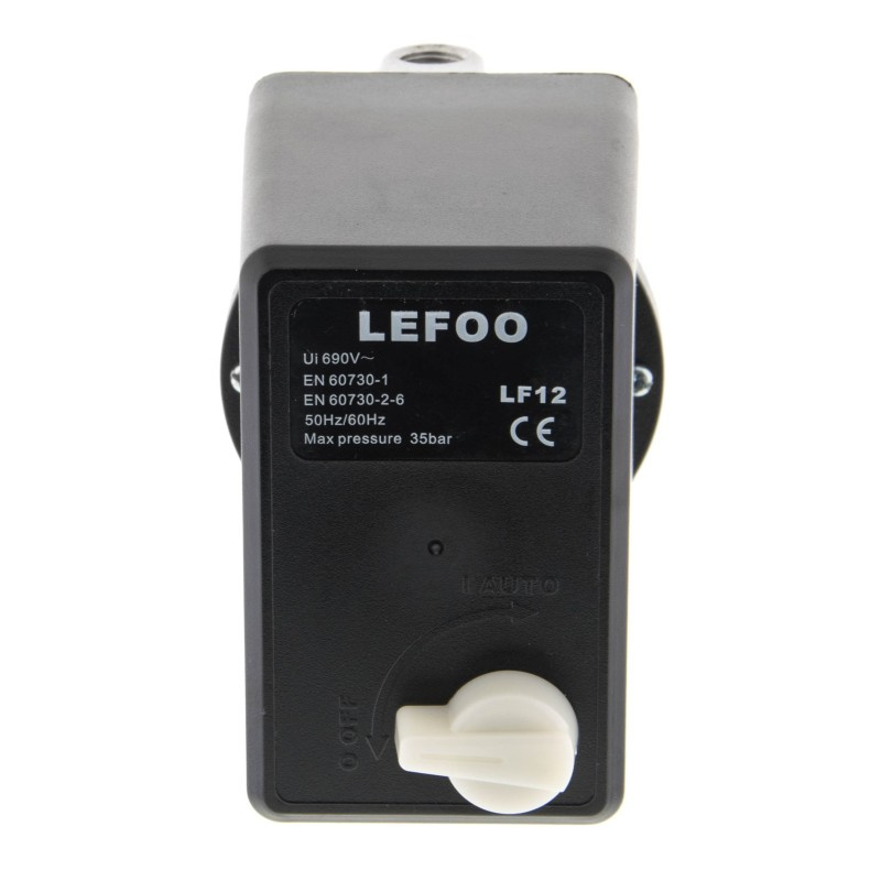 Przełącznik ciśnieniowy marki LEFOO, używany do utrzymywania ciśnienia w zbiorniku kompresora pomiędzy zadaną górną i dolną wartością ciśnienia. Sterownik przeznaczony do silników trójfazowych.