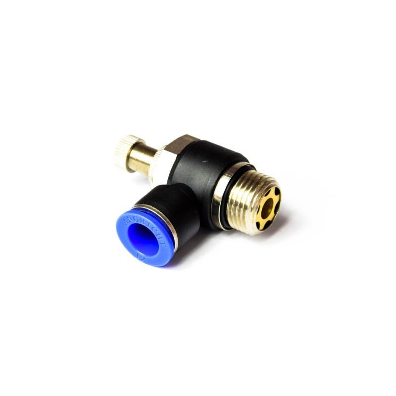 Kątowy zawór dławiąco zwrotny do instalacji pneumatycznych pozwala regulację przepływu czynnika roboczego w jednym kierunku. Połączenie pomiędzy częścią metalową, a korpusem z tworzywa pozwala na wykonanie obrotu w celu odpowiedniego ułożenia kierunku przewodu. Zawory tego typu służą do regulacji prędkości siłowników, ograniczania przepływu itp., nie służą do zamykania dopływu powietrza.