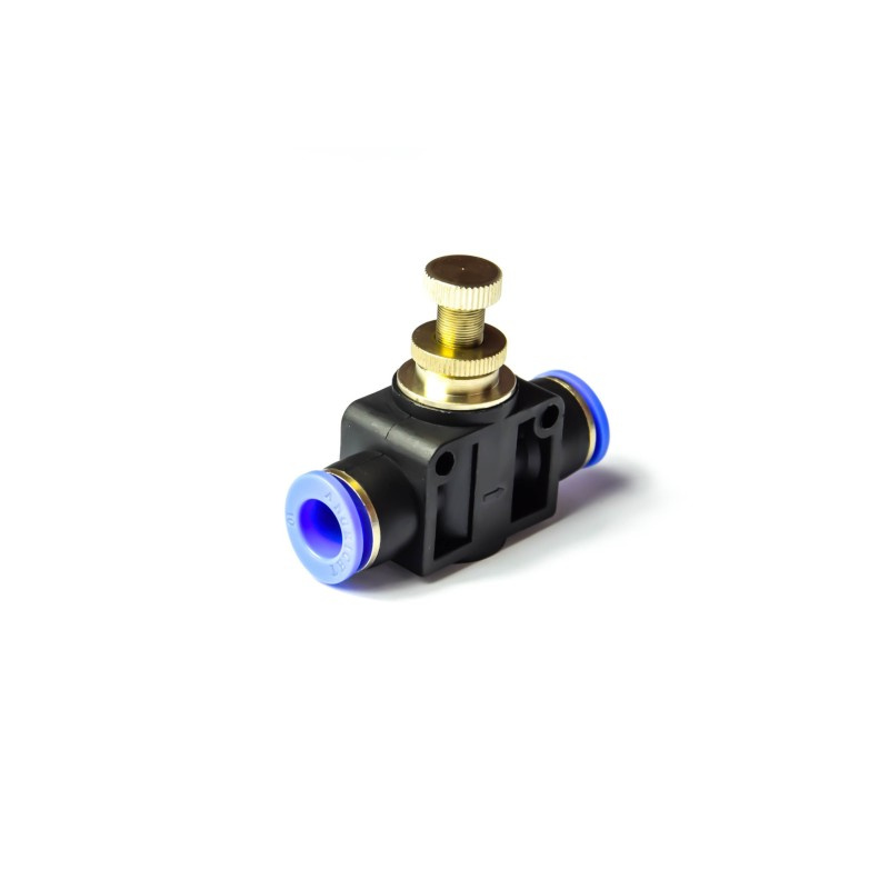 Zawór dławiąco zwrotny do instalacji pneumatycznych pozwala regulację przepływu czynnika roboczego w jednym kierunku. Zawory tego typu służą do regulacji prędkości siłowników, ograniczania przepływu itp., nie służą do zamykania dopływu powietrza.