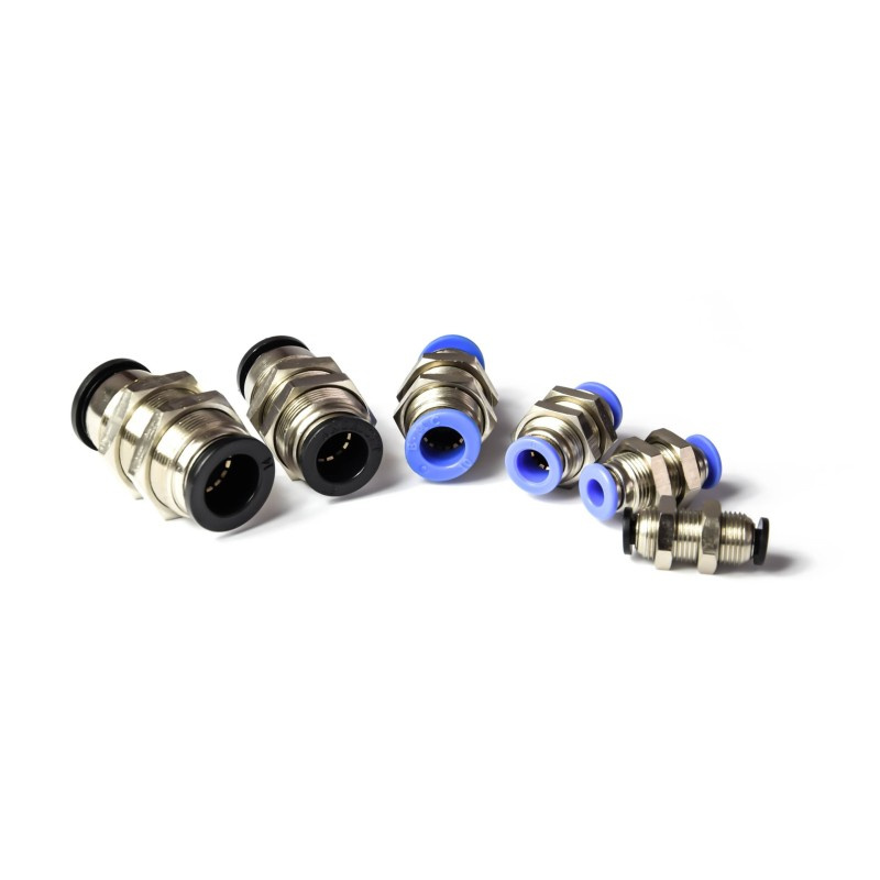 Złączka wtykowa, grodziowa typu łącznik przelotowy do instalacji pneumatycznych pozwala na proste i szybkie łączenie przewodów pneumatycznych. Złączka tego typu pozwala na łączenie przewodów i rurek po dwóch stronach ścianki, blachy itp. W zestawie nakrętki mocujące.